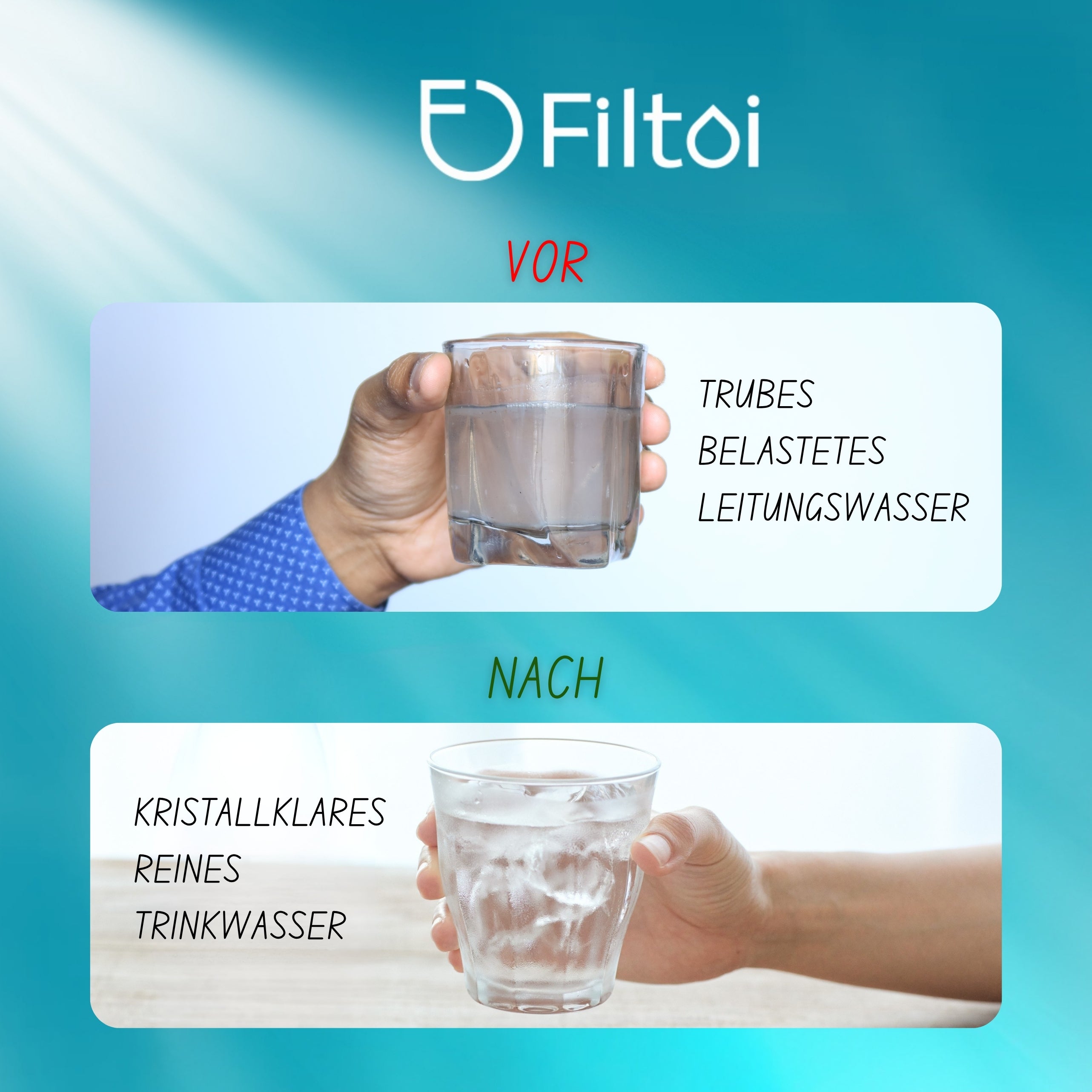 Mit Filtoi™ genießen Sie reines, sanft gefiltertes Wasser, das Ihre Haut beruhigt und sie vor Belastungen schützt.